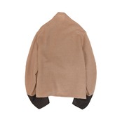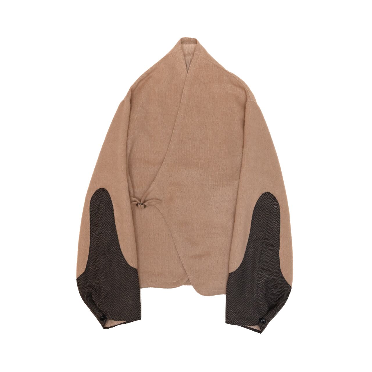 袖には波打った模様のポリエステル素材を用い、全体の柔らかな印象を締める役割を担っております。また、袖口には本水牛釦が付属し、留め方によりフォルムの調整が可能です。