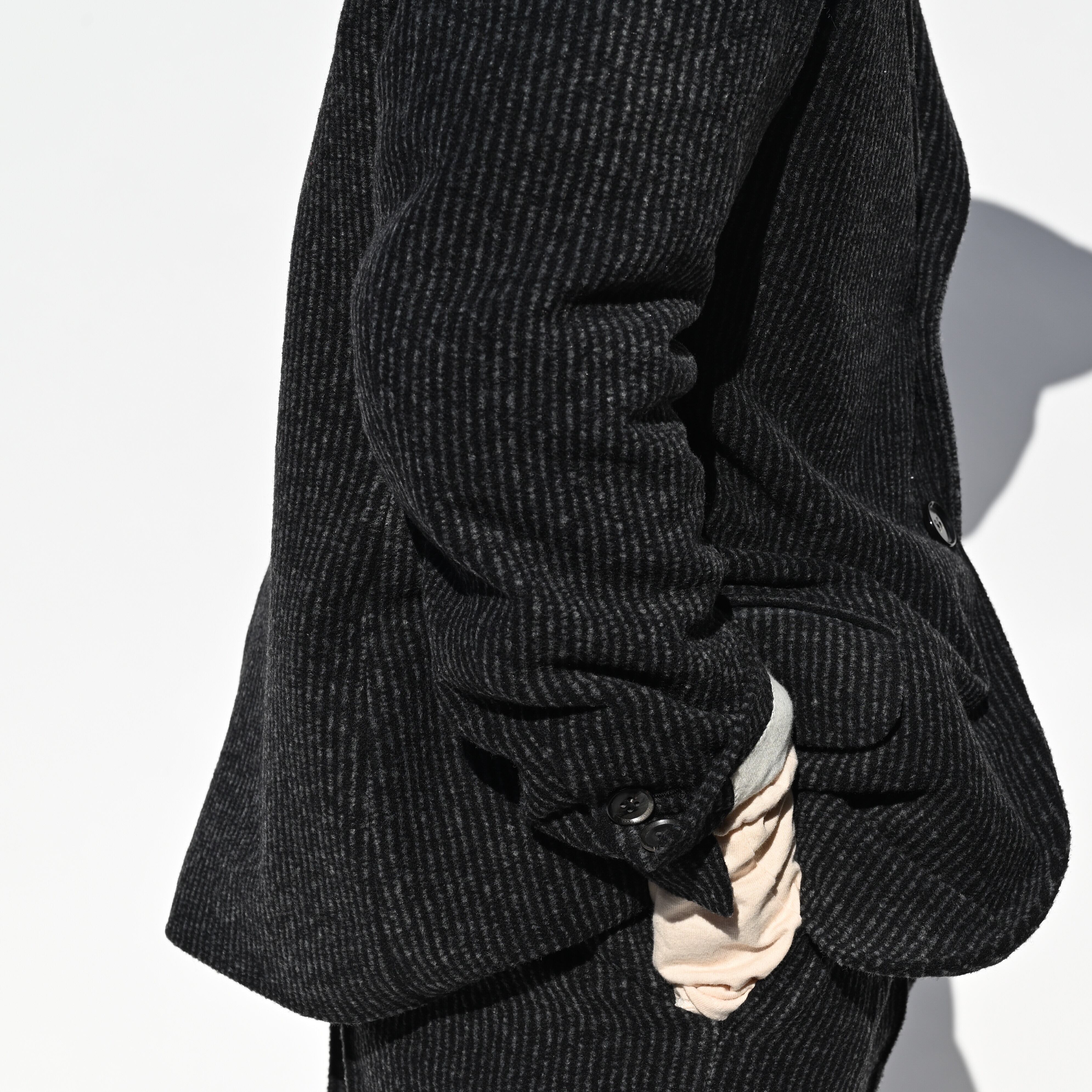 アームホールを縮め、肩先に丸みを帯びるよう設計されており、そのフォルムを内部の毛芯が支えています。
