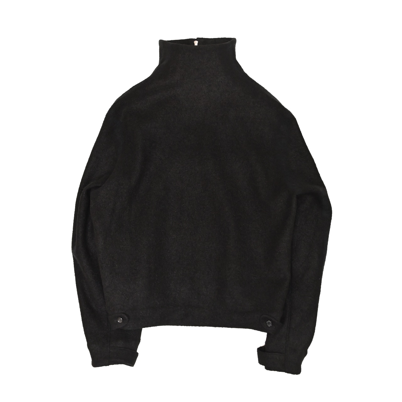 ハイネックの構造線や肩接ぎ、アームホール等にメリノウール原毛をニードルパンチ刺繍で叩き、シームをぼかすことで独特な丸いフォルムが強調されています。